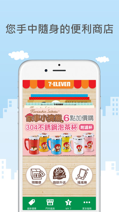 【首页】让您一手掌握最完整的活动资讯。预购便让您随时掌握最热门的商品预购;咖啡外送功能让您快速致电门市,轻鬆坐享香醇浓郁的CITYCAFé;摇摇乐趣味小游戏推荐餐点让用餐变得更有趣。【最新优惠】提供您取得主题活动、精选美味、严选商品、便利生活中最即时的优惠活动。