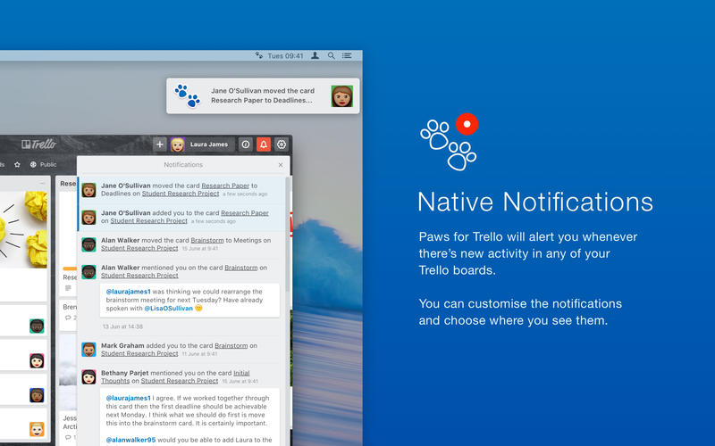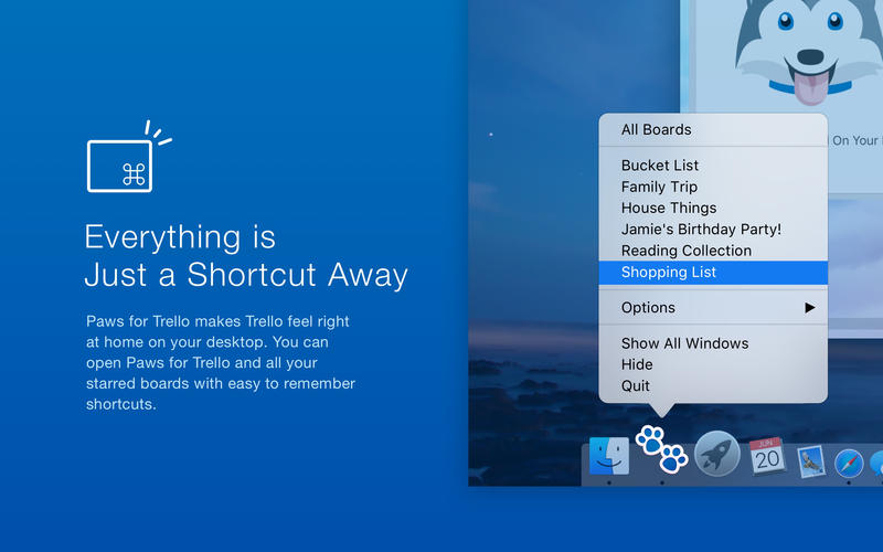 PawsforTrelloMac版是一款macOS平台上的Trello客户端工具,可以在mac电脑上运行的Trello客户端,Trello的实时消息推送、快捷操作,免除在使用浏览器导致分神的烦恼。Trello是由著名的软件工程师JoelSpolsky开发的一个团队协作平台,PawsforTrelloMac版就是一款MacOS平台上的Trello客户端。PawsforTrelloMac版允许你快速访问你的trello帐户直接从你的Mac的菜单栏。