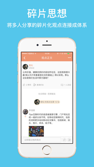 同路人是一个基于观点、经验和见解的知识社交平台,并主张用图片表达自己的感悟和想法。在平时的工作和生活中,每个人都时常闪现出对某件事、某些人的看法和观点。这些感悟和想法往往是很宝贵的,但大多数时候,总是在我们来不及记录的情况下就消失了。现在你可以随时随地在同路人上分享这些零碎的观点,并与朋友进行知识互动,基于碎片思想的知识社交会带给你一种全新的体验。