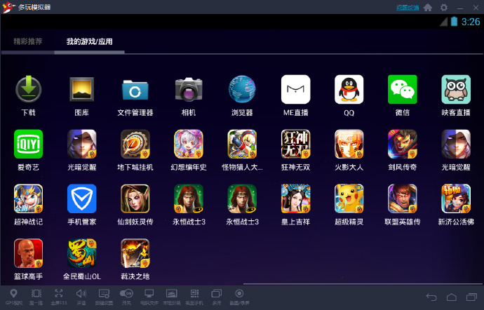 多玩模拟器基本标配了市面上其他所有的功能,包括GPS模拟、摇一摇、全屏显示、声音调节、按键控制、电脑文件共享、本地安装APK、二维码扫描安装到手机、多开管理器、截图/录屏等功能。
