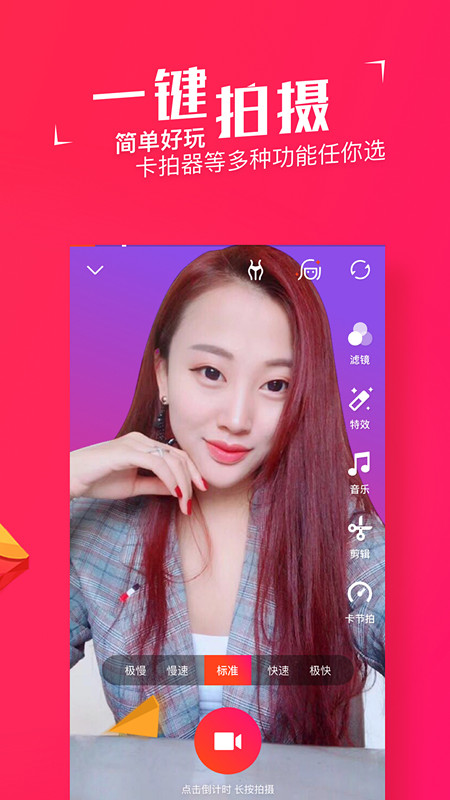 美颜、滤镜、瘦身、快慢速、分段拍摄、卡节拍、本地音乐上传、等多种拍摄功能,简单又好玩