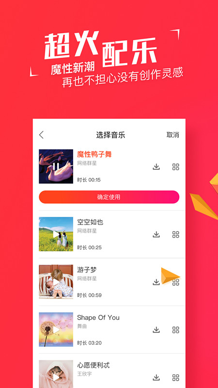 魔性、新潮的音乐,搭配舞蹈、表演、古装、手势舞等多种内容形式,让你情不自禁参与进来,拍摄过程中更换音乐,让你制作有趣音乐从此不再困难