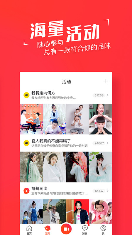 【海量活动,随心参与】官方每日新活动,挑动你不一样的神经。超多达人发起的活动,总有一款符合你的品位,与社区达人零距离接触随时随地欢乐互动,以活动为主题,总有让你聊不完的话题,也许下一秒话题中心就是你。