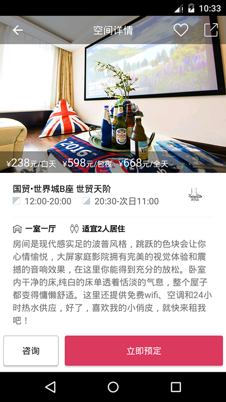 互联空间是国内专业的精品公寓在线短租,我们致力于为用户提供精品的短租公寓,让用户感受精致的布置、齐全的设施及贴心的服务,在旅游或过夜的过程中感受到难忘的体验。公司成立于2015年,完善订房流程、客户服务,建立了微信服务号及APP,并通过自营短租公寓,摸索出精品短租的设计、打造及服务标准。您可以随时随地打开互联空间APP,选择自己喜欢的短租公寓,并且我们有更灵活的出租模式,白天、夜晚的分时段出租可以大大节约您的消费支出。