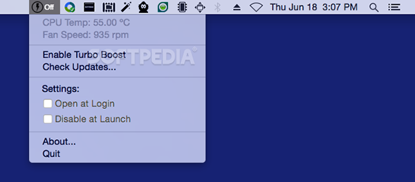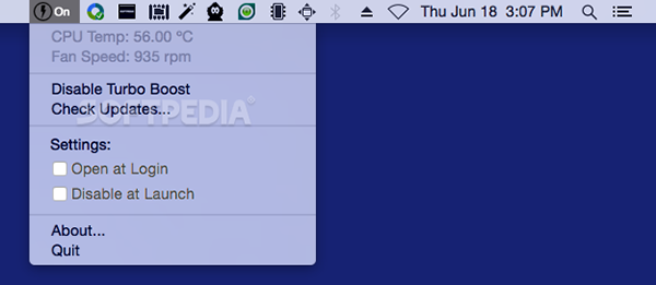 Turbo Boost Switcher软件的操作非常简单,在 Mac 屏幕顶部菜单栏的图标,就能开启/关闭 Turbo Boost 功能。至于效果,根据很多网友的测试,可以延长 1/4 的续航时间,而且 CPU 温度降低了很多。