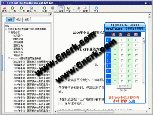 《公务员考试试卷宝典V2010-免费下载版》是www.17ks.com一起考试——公务员考试网为大家提供的人机自动检测试卷。本软件包含2000年——2010年国家公务员考试试卷全部行政能力测试真题,每套试题都有答案并付完整详尽的分析,是目前最为完善的试卷集合,适合参加国家公务员考试和各省市公务员考试考试前“”练兵“”使用。当选择一套试卷后,点击“”记时“”,系统就开始进行计时,点击“”交卷“”后,系统将判断对错,统计得分,并把每道试题的答案和分析详尽地显示出来。本软件完全免费、绿色(不用安装)、无插件,是要参加是公务员考试的朋友不可多得的软件。