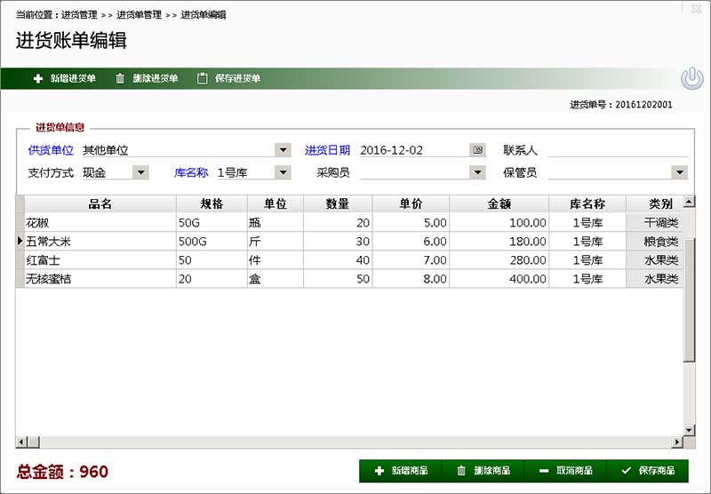 1 进货管理:进货账单的维护、进货账单的浏览、历史进货单付款、进货报表。