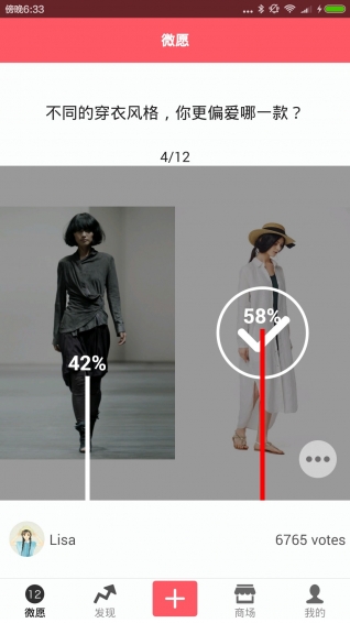 1.查看其他人的微愿和系统推荐的微愿,选择喜欢的图片进行投票2.创建自己的微愿,上传两张图片进行对比让其他用户进行投票