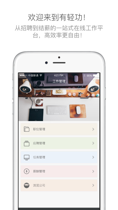 有轻功app是从招聘到发放薪资完整的线上办公saas平台。提出网络办公概念,提供在线面试、直聘、组成团队、工作直到发放薪资的完整线上服务体系。
