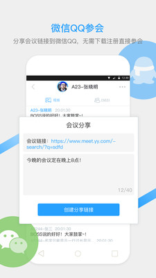 快速分享:支持一键创建链接分享到其他平台,邀请小伙伴快速进入会议,无需下载安装注册。