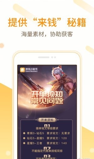 游戏小秘书APP是利用众包模式,使每位玩家都能成为独立流量入口,形成用户与订单的迅速涌入。“小秘书”是一个专业且有温度的游戏管家,他帮玩家管理游戏所有事务,无论是找大神上分、陪练,还是买装备、换皮肤,小秘书都可统统搞定。游戏小秘书app是游戏后服务分销市场的开创者。游戏小秘书app依托于“源于玩家,服务玩家”的核心理念,致力于为亿万玩家提供便捷、贴心、高性价比的游戏服务体验。