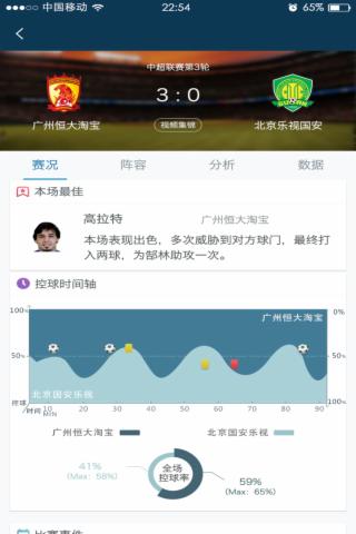 2、拥有国内和国际最详尽的球员、球队和比赛等数据。你可以了解到每名球员的动态、伤停、微博体简介;每支球队的阵容、积分、赛程;每场比赛的前瞻、数据、首发阵容。甚至你可以看到搜达足球独有的控球时间轴。这么多不可思议的足球数据,想想就好激动呢~