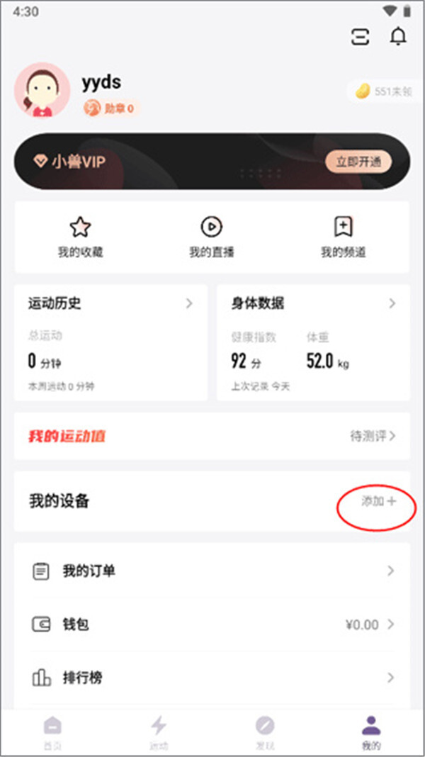 2. 在个人中心里,选中“我的设备”,接着点击右侧的添加按钮。