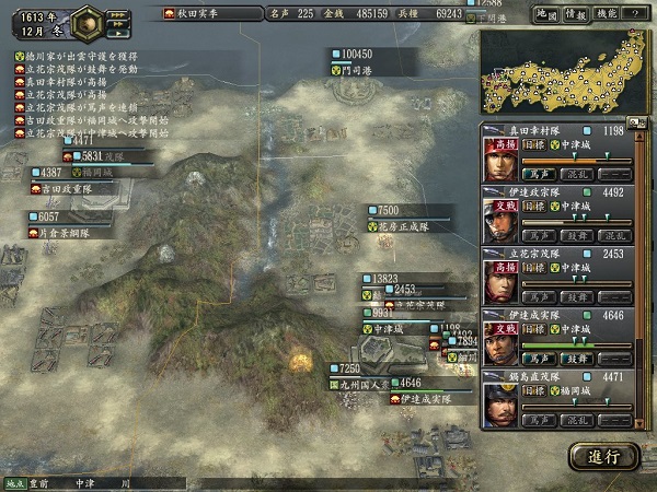 12.雾山支城兵力西进自己看着打,明确目的就是打到赤松收到黑牛为止,此时西进第一战筒井注意先吸出兵来境边解决,后面闭着眼睛打就是了,我第一次10小时完成统一,第12步之后收到黑牛不久铁定会出包围网,但很轻松他们就会逃回去只是象征性攻击一下你。