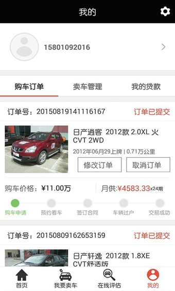 4.个人中心:购车订单,卖车管理,我的贷款,一目了然