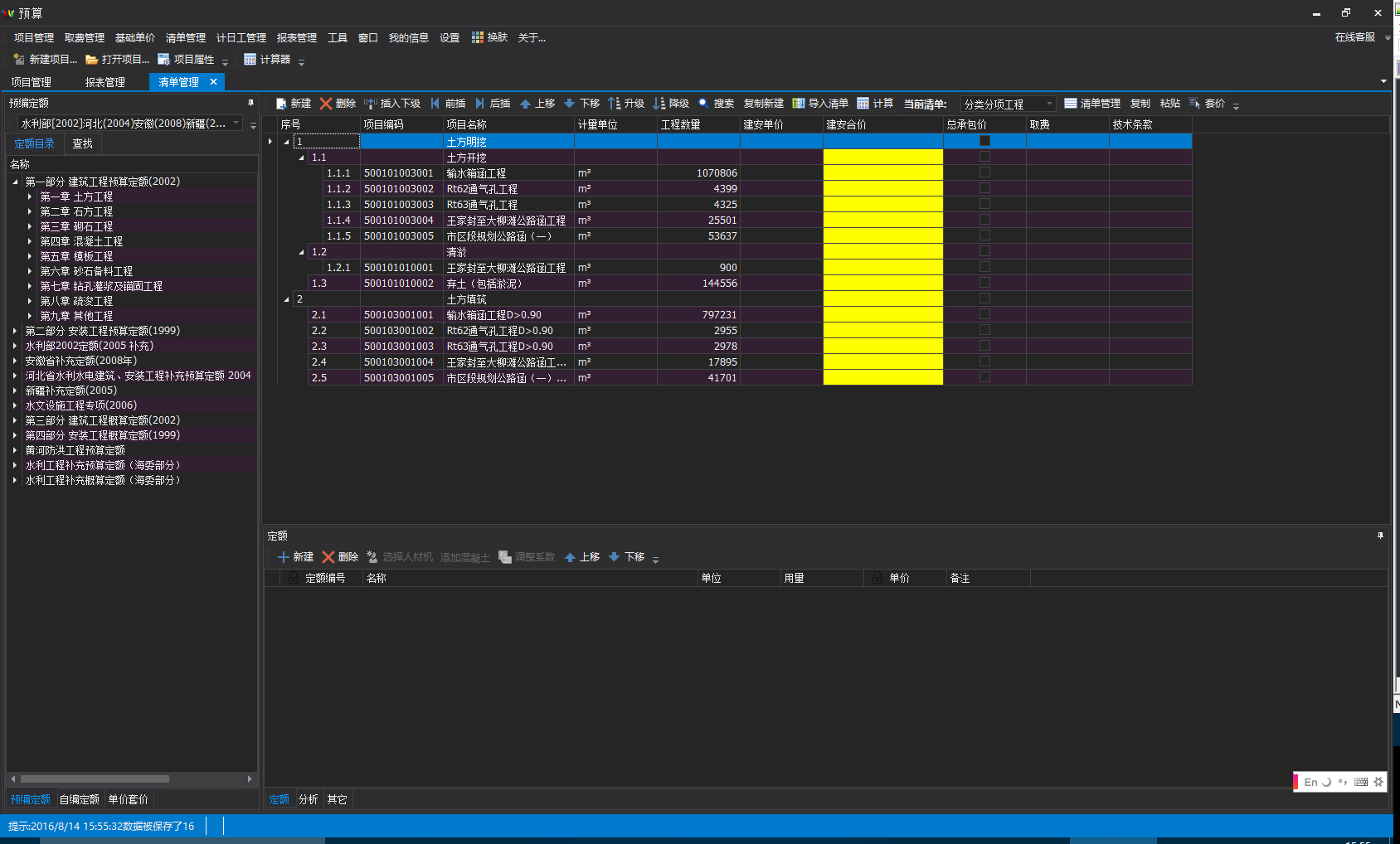 软件主要是按照水利部2002年颁发的《水总[2002]116号》文件所包含的编制办法和定额内容进行的设计和开发,同时兼顾了黑龙江、山东等省市的相关水利工程设计概(估)算方面的定额要求。