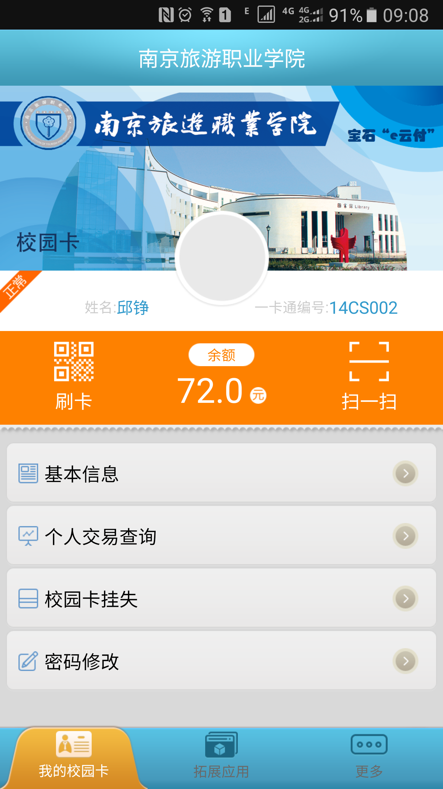 提供校园一卡通的自助查询及服务功能,系统功能及数据来源于所在学的一卡通系统。提供个人信息查询、个人交易查询、自助挂失、修改校园一卡通密码等基础业务,同时提供其他圈存、缴电费、缴网费、财务缴费等拓展业务。并具有校园一卡通的私有云,提供条码机二维码支付功能。