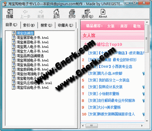 淘宝购物电子书V1.0是通过淘宝API接口管理数据,可以令你无时无刻看到最新的淘宝商品,淘宝购物电子书V1.0实现了“”桌面淘宝“”,放在桌面,“”淘宝“”只需双击,省时省力。自由:想删就删,免费:永久免费使用,安全:无自动更新,无后门。淘宝网页版:www.pigsun.com 本电子书的功能是店铺和商品分类导航,所以您必须在连接到网络的状态下点击店铺或者分类名称才能进入您要的页面。祝您购物愉快!