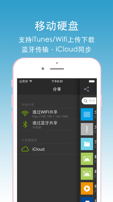 * 在WIFI环境下,可以通过浏览器上传下载文件在应用中的文件,让你的手机瞬间成为一个无线硬盘。可以为浏览器访问设置密码以保护隐私* 和其他安装应用的苹果设备通过蓝牙交换文件,包括相册中的照片。