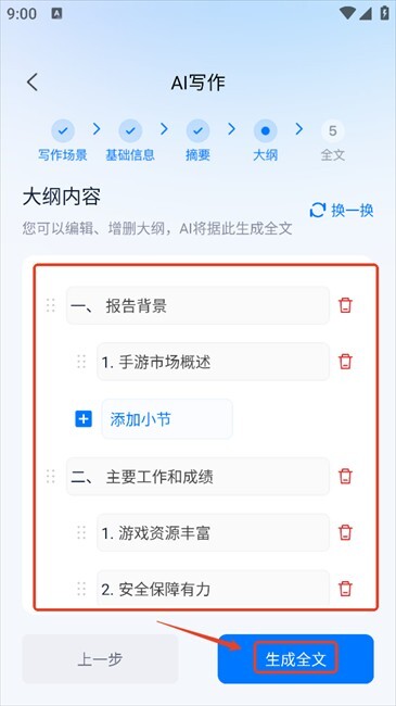 5. 按照实际需求对大纲内容进行编辑,编辑完成后,点击“生成全文”按钮。