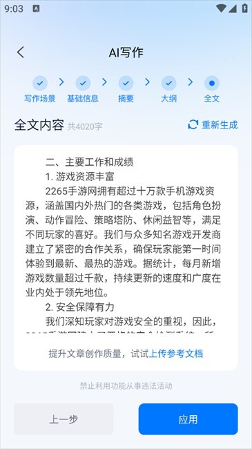 6. 能够查看具体生成的完整文章,若有此需求,点击“应用”即可。