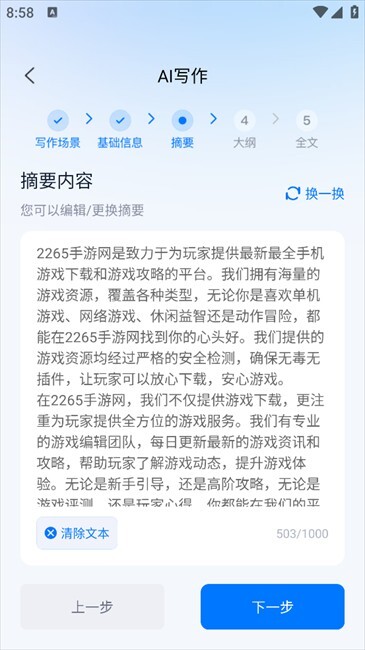4. 获取生成内容后,点击“下一步”。