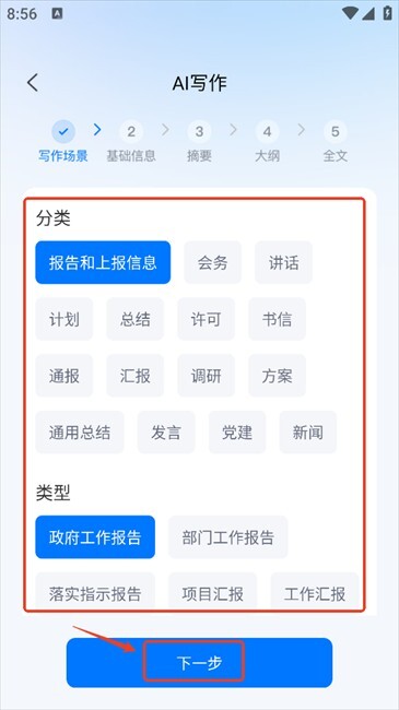 2. 选定写作分类与类型后,点击“下一步”
