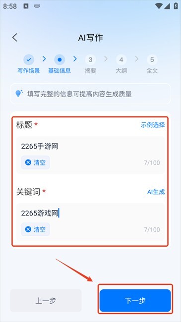 3. 填入标题与关键词的基础信息,随后点击“下一步”。