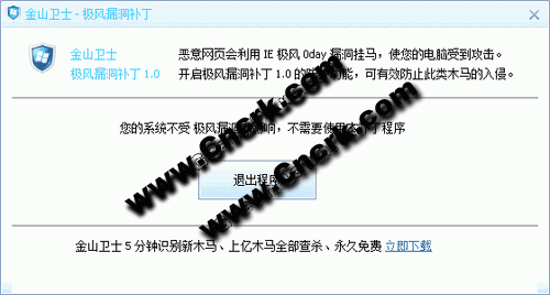 金山安全实验室率先截获了国内首例IE极风0day漏洞进行挂马传播的案例,这表明IE极风0day漏洞攻击将大规模爆发。截止目前为止微软官方目前尚未发布相关补丁,为此,金山卫士独家提供解决方案,用户只需要下载应急安全补丁,即可有效防止木马入侵