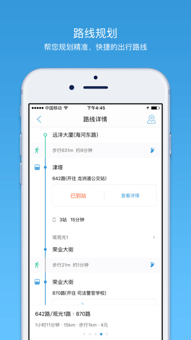 ①数据精准:输入公交线路OR公交站点名称,准确告知您欲乘坐的任一公交车当前位置、发车时间以及到站信息。②功能全面:周边线路地图导航,附近公交距离多远、还有几站到一目了然;输入起点和终点,智能筛选出多种换乘方案,提供详细的可行性线路和公交站牌信息。