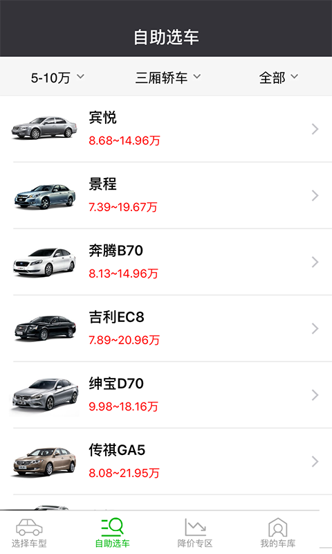 【自助选车】:提供便捷汽车报价筛选条件,让车主快速查找到想看的车,可享受新车试驾,全国汽车价格咨询,组团买车