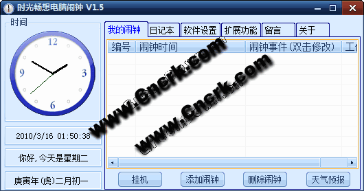 时光畅想电脑闹钟 V1.5 简体中文绿色免费版 时光畅想电脑闹钟是一款配置灵活多样的时钟软件,它分为多个界面,一个是主界面(控制整个闹钟)时间显示界面(显示年、月、日、时、分、秒)及当地天气预报 ,可通过网上标准时钟资源自行矫正,可定时控制其它程序的运行,可锁定电脑,可隐藏闹钟,设置提醒方式(比如播放音乐、到时关机、到时闹铃、弹出窗口、语音报时、进入屏保),有整点报时功能,并可设置报时的声音。本闹钟也添加不不少实用功能(比如网络校时、生肖和星座、历史上的今天、万年历、手机归属地、IP查询、天气预报、股票外汇、新闻等)