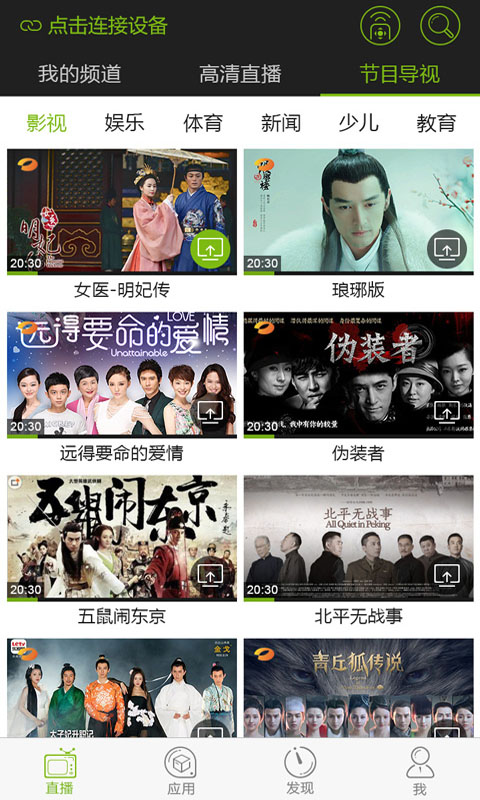 ①高清直播:打开手机就可查看电视机上所有频道正在播出的电视节目单,点击节目名称就可以直接遥控机顶盒切换频道播放此节目。
