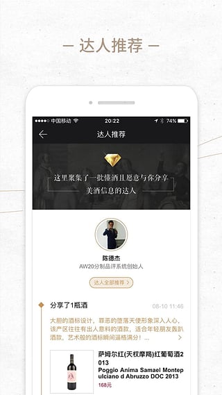 1.人性化的登陆方式社交账号/手机验证直接登陆。喜欢就要收藏,或分享给像你一样爱酒的人。