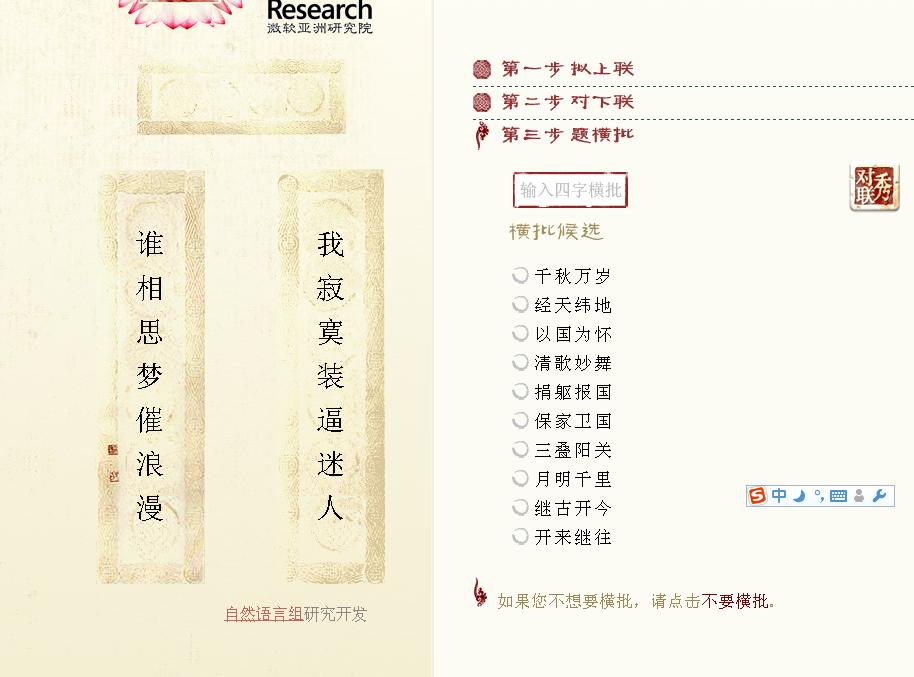 对联生成器是由微软亚洲研究院自然语言计算组研发的计算机自动对联系统。 对联生成器的原理是根据二元化原则进行工作,具有合成对联的能力。首先用户给定上联,然后系统自动提供若干下联供用户选择, 用户可以通过交互手段优选字词来生成满意的下联;当确定一副对联后还可以生成若干四字横批供用户参考。对联生成器不一定可以生成情境一致对联,但可以为初学者参考。对联生成器能识别词性相当、平仄声律和字数限制。 目前本系统可处理十字以下的对联。