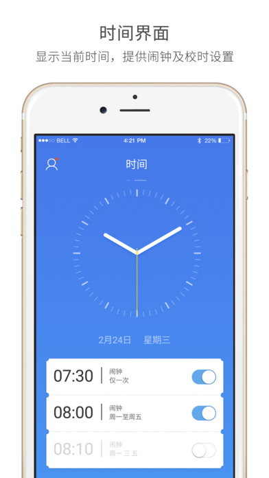 时间界面:显示当前时间,提供闹钟及校时设置。