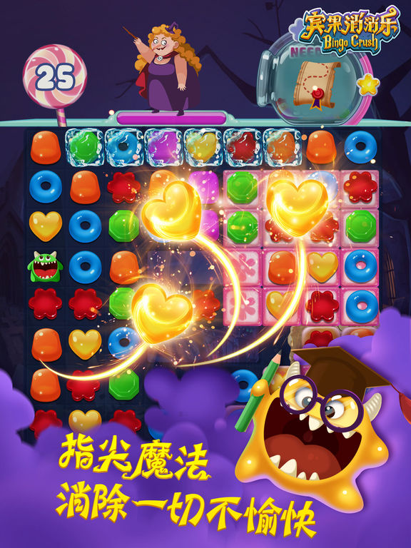 三个女巫一台戏,要么射出几个小怪兽,要么赐予几颗硬糖,要么冰冻某些糖果...总之,她们会想尽一切办法,不让你安宁,唯一的办法就是你必须尽快的消灭她们。