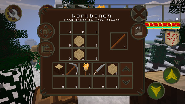 在标准操作模式下,进入游戏后左上方齿轮状图标为设置,往右数第二个像藏宝图的为小地图开关,第三个是物品,再往右为快捷物品栏。在生存模式中快捷物品栏下面红色的为生命值,蓝色的为饥饿度,当饥饿度为零时生命值会快速下降。