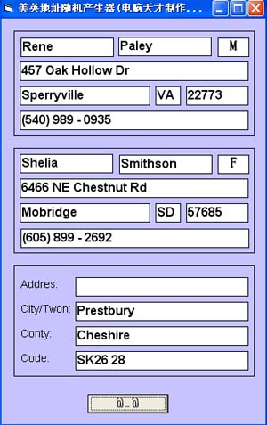 去国外论坛或网站注册会员的时候,很大一部分都需要提供信用卡卡号及国外的一些地址,而我们国人又啥都不知道的时候,这个功能强大的美国地址生成器就产生了,完美绿色破解版,生成速度快。