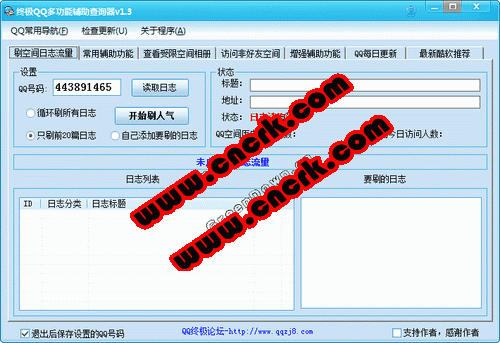 终极QQ多功能辅助查询器能刷QQ空间日志流量,强聊QQ,快速查询指定QQ的QQ在线状态查看头像,快速打开指定QQ的QQ空间、QQ相册,同时还能查询指定QQ的QQ秀等功能。