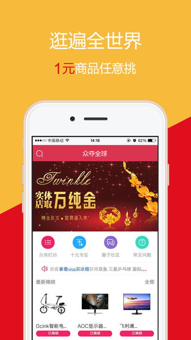 众夺全球app通过一种全新的互动购物体验方式,让消费者用1元钱满足各种购物需求,给梦想一个机会!【软件特点】