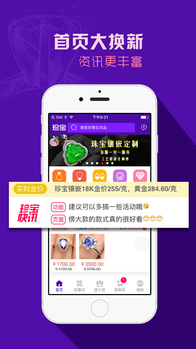 珍宝手机应用是广州市珍盛珠宝有限公司旗下产品,为移动用户推出的一款关于珠宝的APP,满足了线上购买珠宝、定制珠宝等需求。具有款式参考、珠宝镶嵌估价器、尺码表、贵金属行情。给用户提供了一个珠宝购买及定制服务的入口。【更新日志】