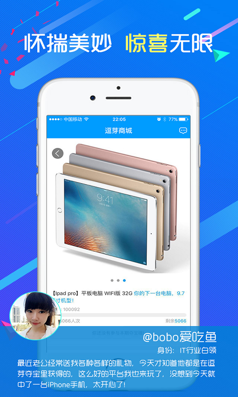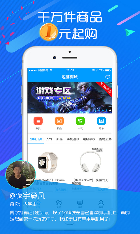 【实现梦想,只需一元】一元获得一个幸运号,人满即开,无需长久等待,一元收获您的梦想!【正品保证,全国包邮】逗芽商城承诺所有商品100%正品,全国包邮,中奖后不需要支付任何邮寄费用,就是这么贴心!