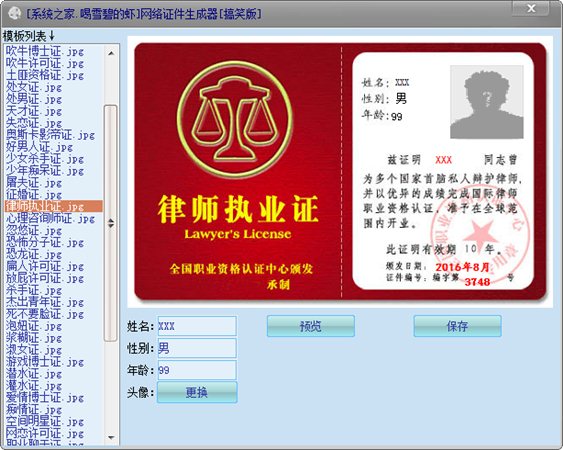 证件生成器是一款可以制作恶搞证书的软件,软件自带51个网络证件模板,都是灰常灰常搞笑滴,软件必须解压后运行,否则检测不到模板。要添加模板的话,可以在软件的“模板”文件夹中添加文件,软件会自动检测。
