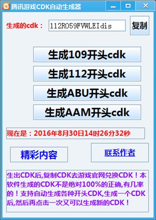 腾讯游戏CDK生成器 v1.0 绿色免费版 腾讯游戏CDK生成器是一款针对腾讯旗下游戏所推出的CDK生成器,该软件能够通过随机的算法计算出腾讯的CDK值,生产出的CDK可去游戏官网兑换英雄联盟皮肤、CF枪械等,非常实用!