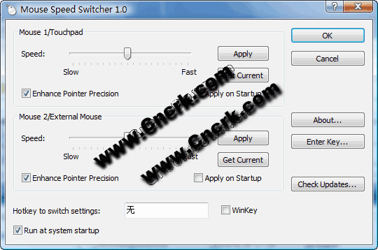 Mouse Speed Switcher,是一款专业的鼠标灵敏度调整工具。笔记本外接鼠标的反映速度是有点慢的,在游戏的时候由为突出!虽然切换两种不同的鼠标的笔记本电脑是不同的速度和感光度设置您需要手动设置当您切换您的鼠标。Mouse Speed Switcher是您理想的笔记本电脑用户之间进行切换使用触摸屏和一个外接鼠标 ,但希望有一个不同的指针速度/灵敏度为每个设备。具备速度调整、两个鼠标切换,鼠标和触摸板鼠标切换,触摸板鼠标增强等几个功能
