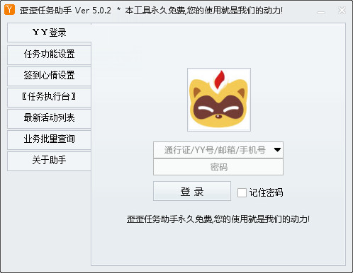歪歪任务助手是可以帮助完成YY任务的辅助工具,YY任务都有什么,通过YY任务助手你就知道了,软件可以全自动YY签到做任务、最新活动列表等功能,完全免费,有需要的赶快下载吧!【软件特点】