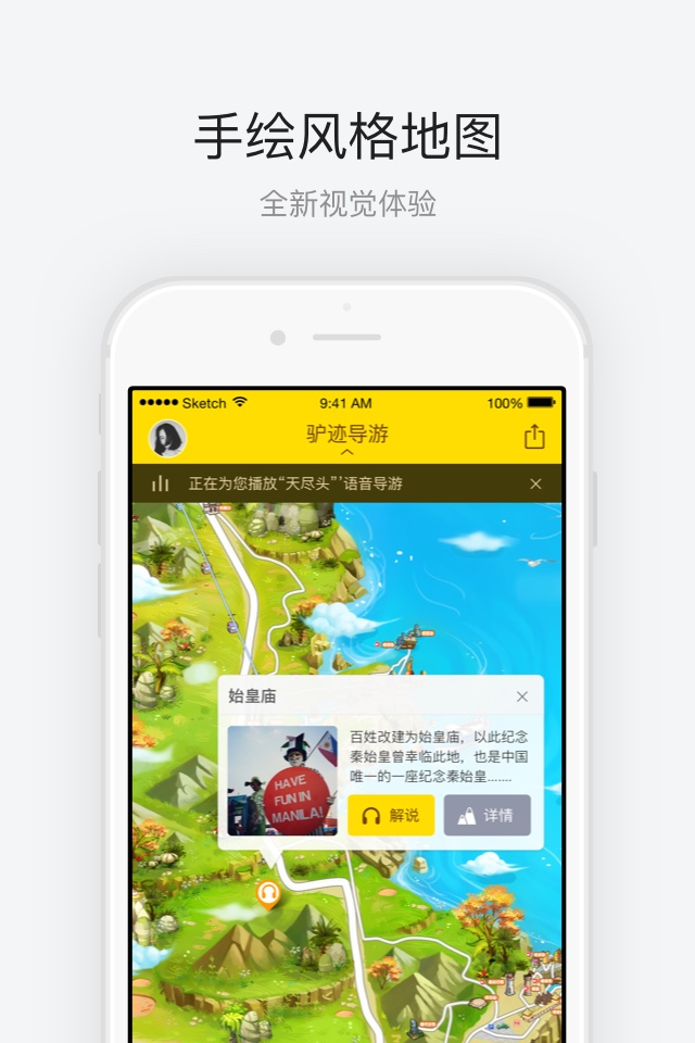 语音导游:专业主播录制的景点讲解及到点播报,多语种支持,走到哪儿听到哪儿。手绘地图:为景区量身定制手绘卡通地图,让您轻松看懂地图,永不迷路。