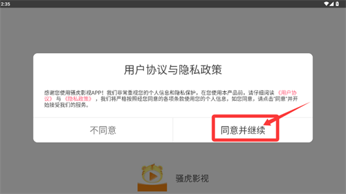 1、启动骚虎影视,在协议确认界面点击同意并继续选项。