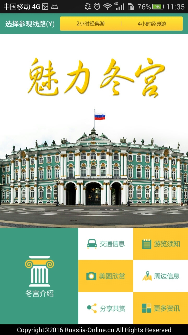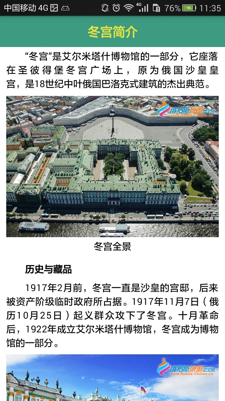 俄罗斯旅游中文网的【】自助游导览,利用多种展示方法,提供冬宫各展厅、藏品、精选参观线路以及其他详细介绍。主要功能有: